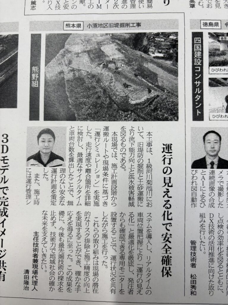 日刊通信建設新聞社様より当社現場である「小原地区旧堤掘削工事」の工事内容が掲載されました。本現場の取組みである運搬車の運行シミュレーションが取り上げられており、走行時の安全や施工の効率化など新しい土木の可能性に挑戦することが出来ました。